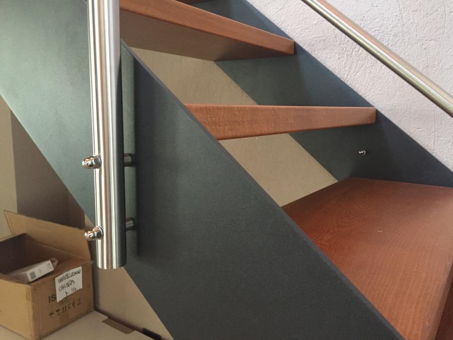 Scala con cosciali in ferro taglio laser e gradini in legno e ringhiera semplice in acciaio inox satinato